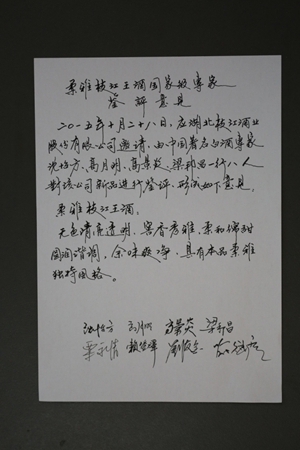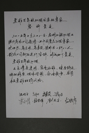 专家们在集体品评了柔雅“星空王”和柔雅“百年星空”后,给予了这两大单品很高的评价。中国酿酒大师、中国白酒专家委员会专家赖登燡先生当场挥毫写下“韵雅香远”,还送给星空酒业几幅楹联:一枝清流融江水,千载风雅醉华夏;枝头明月清辉笼乾坤,江上春风香醇流千载。行云流水的行草,苍劲中有清秀,洒脱中有内敛。无论是内容还是笔墨,都与星空酒的风格相一致,表达了与会专家对星空酒业的深情厚谊。