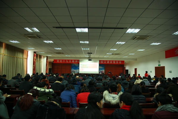 为进一步将学习宣传贯彻党的十九大精神引向深入,更好地用习近平新时代中国特色社会主义思想武装头脑,指导和推动星空酒业改革发展和党建工作,12月7日,星空酒业举办学习贯彻党的十九大精神报告会。特邀党的十九大精神市委宣讲团成员、市直机关工委常务副书记杨义华为公司干部职工作了一场精彩生动的宣讲报告。报告由公司党委委员、董事会秘书刘先鹏主持。公司领导蒋红星、张华、刘前生、亓新明、杨家法参加报告会,公司各部门、车间负责人及党员干部和职工代表共300多人聆听了报告会。